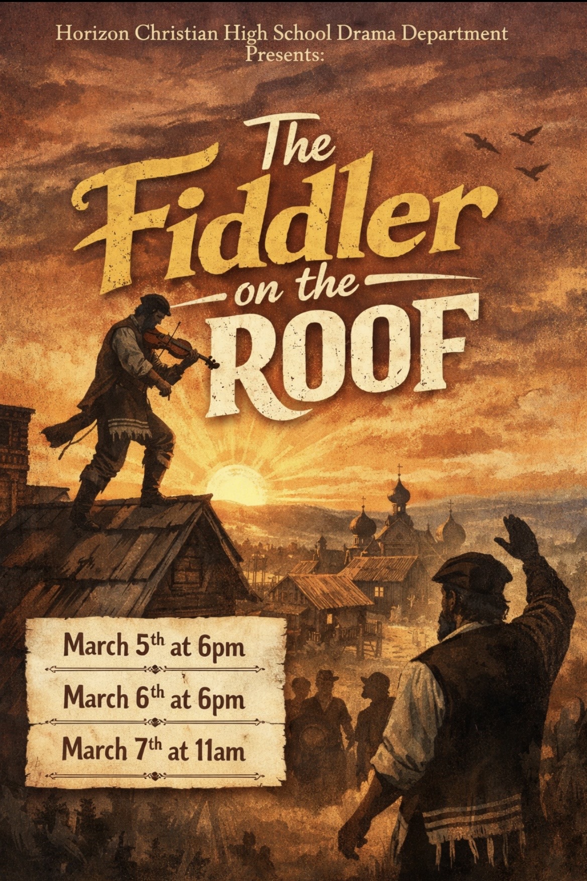 Set in the small village of Anatevka, this beloved musical follows Tevye, a devoted father striving to balance his deep-rooted traditions with the hopes and dreams of his daughters. Filled with unforgettable music, humor, and powerful moments of reflection, Fiddler on the Roof celebrates love, resilience, and the importance of community.